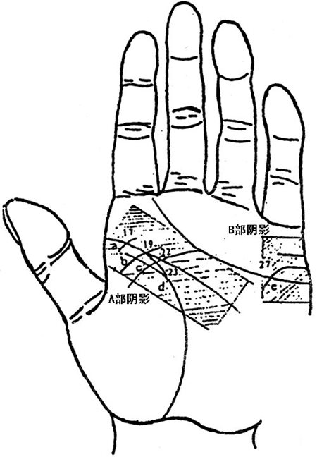 传统的相法看人多大岁数结婚,是从B部的结婚线(家风纹)来断,本人认为有误。试想和尚、尼姑、老道、修女也有此纹,而他们是独身的根本就没结过婚,这作何而论?还有就是书笙给看相的客户中,有的人一辈子没结婚,而此结婚纹却比正常人长的还好,这就更难解释,所以书笙在判断人结婚的年龄点上,不采用家风纹(但可作参考),而是采用感情线与生命线起端的联结点而断,即快y准。同时结合面相前额高广,印堂宽窄,人中深浅而断,即前额高阔,印堂宽广,人中清晰而深,主婚姻早,反之婚姻矣晚,如图所示。
