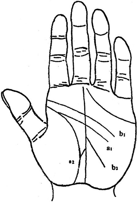 ②人纹与地纹分离如图bl所示,则为外向型性格,胆大活泼,一见钟情者居多,先同居后结婚者居多,再加上图b2之线,则所找的对象自己便能处理,无需别人介绍。